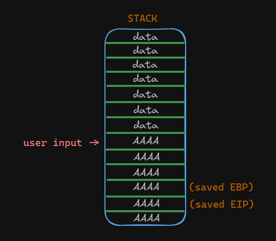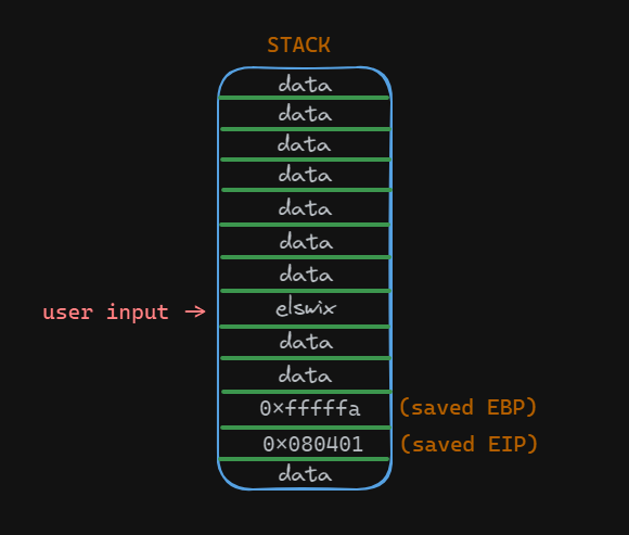This is the stack. In this image, we can highlight the user input, the saved EBP value (saved base pointer), and the saved EIP value (the return address). In the user input, there is a string with the value elswix.