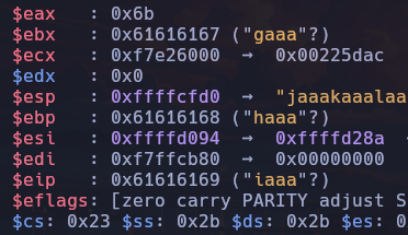 As you can see, the instruction pointer was overwritten with the string iaaa. To find the return address offset, we can use the pattern offset command and specify the EIP register: